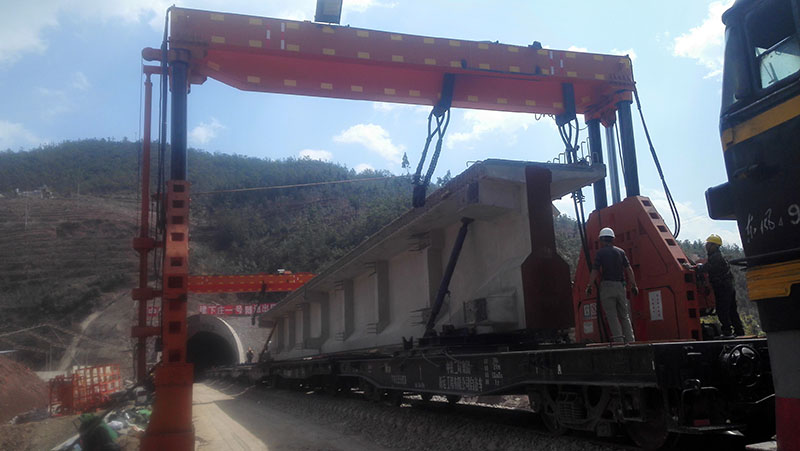 雙線倒裝龍門架是一種跨雙線的梁片或軌排的倒裝龍門架,它可在平車和炮車之間通過橫移方式實現(xiàn)梁片或軌排的吊裝。既適用于雙線倒裝,也適用于單線倒裝。支起時內(nèi)部空間可通過機車。運輸時滿足限界要求。倒裝龍門架主要由增高節(jié)、底架總成、柴油發(fā)電機、液壓系統(tǒng)、電控系統(tǒng)、導(dǎo)向柱組成、升降機構(gòu)、護架組成、起重梁、橫移機構(gòu)、吊繩裝置、油缸總成等部分組成。